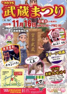 11月16日(日)10時~14時(小雨決行) 美作市宮本「交流館」左側広場にて2年に1度の武蔵祭りが開かれます。 東京よしもとの芸人”チャンバラZ”(チャンバラトリオの1番弟子)や岡山芸人の”京極”、津山出身の歌手”人美 […]