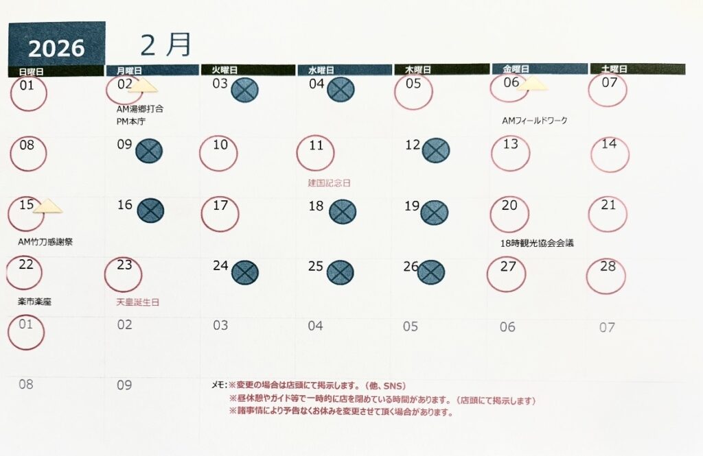 2026年2月営業カレンダー 2024年9月28日 最終更新日時 : 2026年2月1日 大原ムサシ 2月度の営業カレンダーなります。 急遽ガイドを受ける場合などは貼り紙をさせて頂きます。(観光案内所・みやげ屋武蔵共通) ✖は店休み △は閉めている時間あり Bluesky